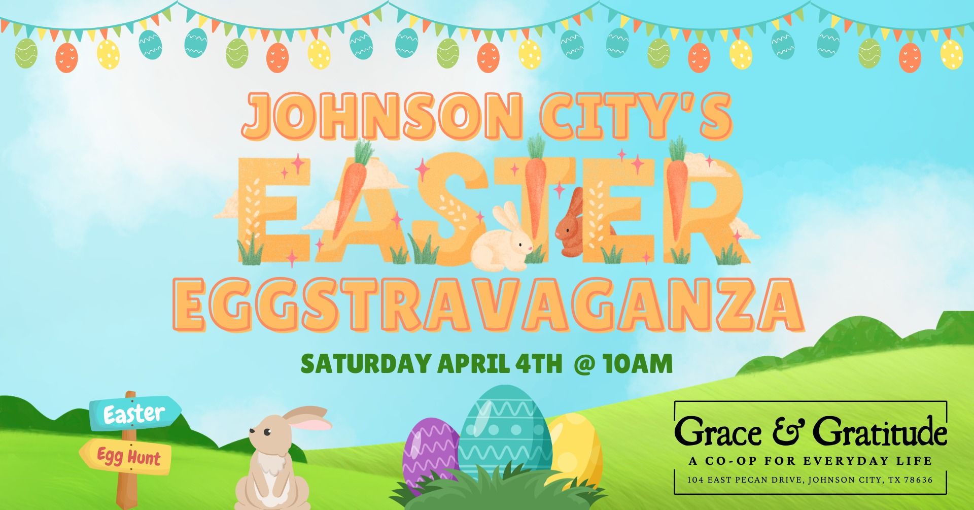 A full-day Easter celebration featuring an egg hunt, BBQ cook-off, car show, vendors, bounce houses, live entertainment, and photos with the Easter Bunny.